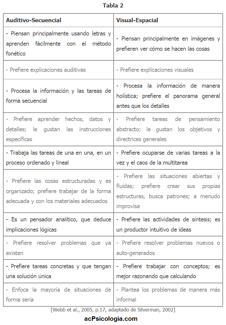 Además de los perfiles de excepcionalidad que hemos visto, es importante para dar la respuesta educativa adecuada completar y combinar lo comentado en el apartado anterior con lo que sabemos sobre los dos estilos básicos de pensamiento y aprendizaje: el estilo auditivo-secuencial y el estilo visual-espacial (Webb et al., 2005).